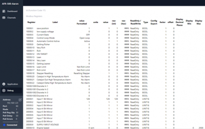 Selecting the debug screen brings up a list view of all available registers which also allows writing into a text field for applicable registers. Additionally, it provides information for the data type and whether the register is read only or read/write.